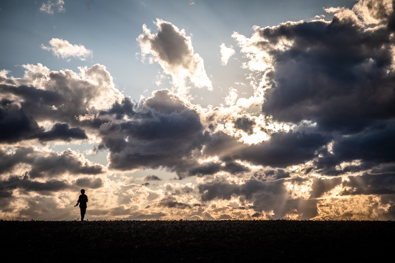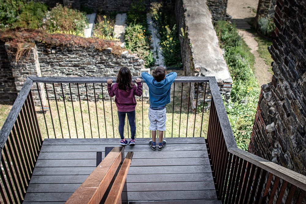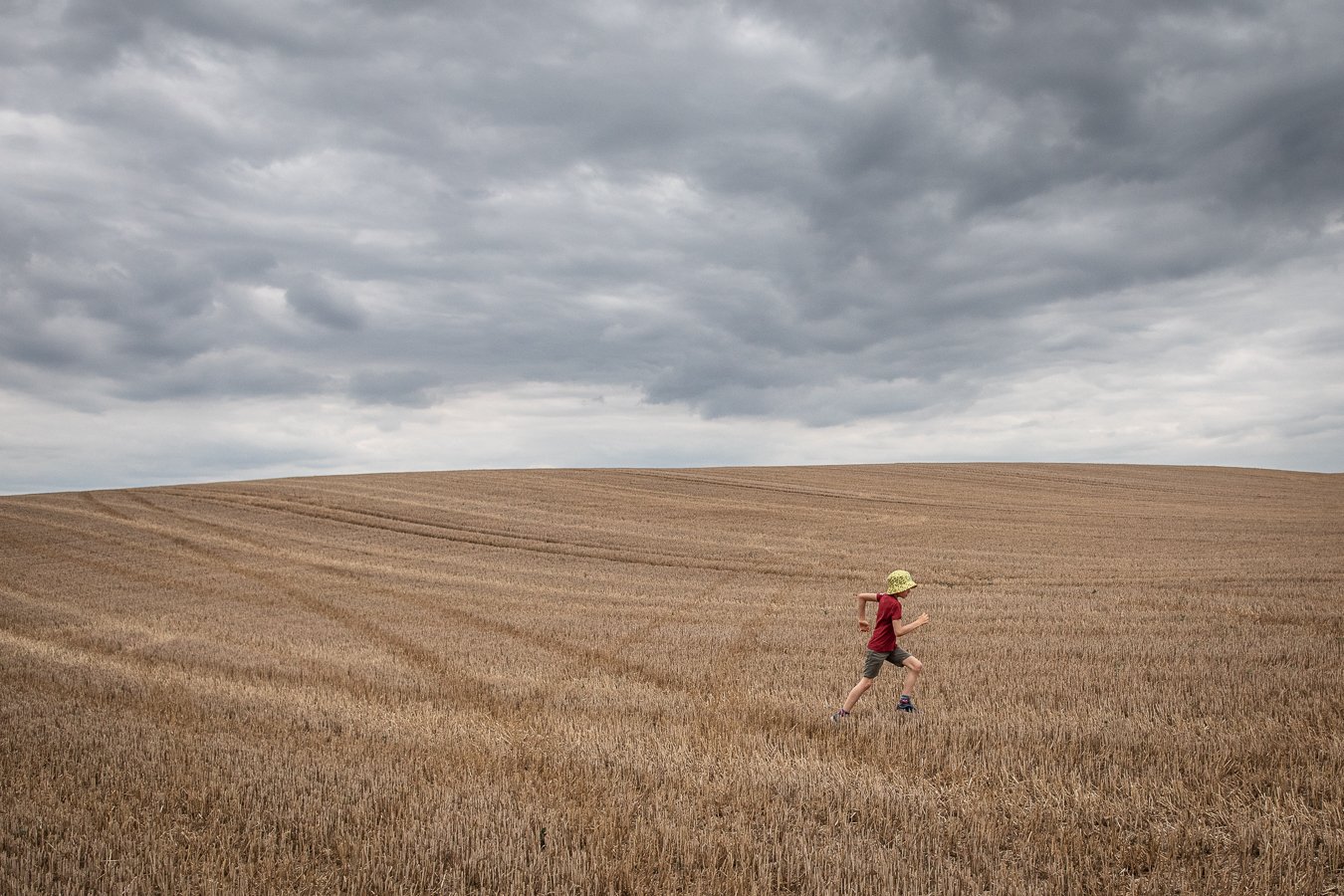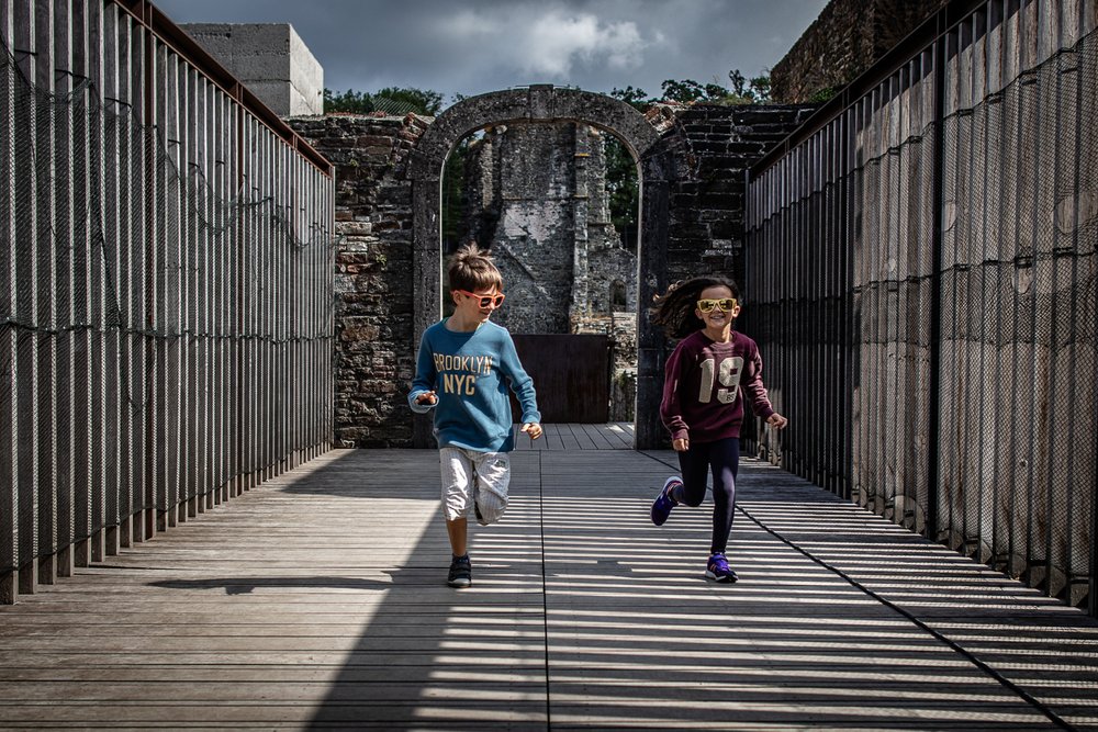 Garçon qui joue dans une pièce. Il semble courir. La pièce est lumineuse. Il y a des faisceaux de lumières qui passent dans les arches.